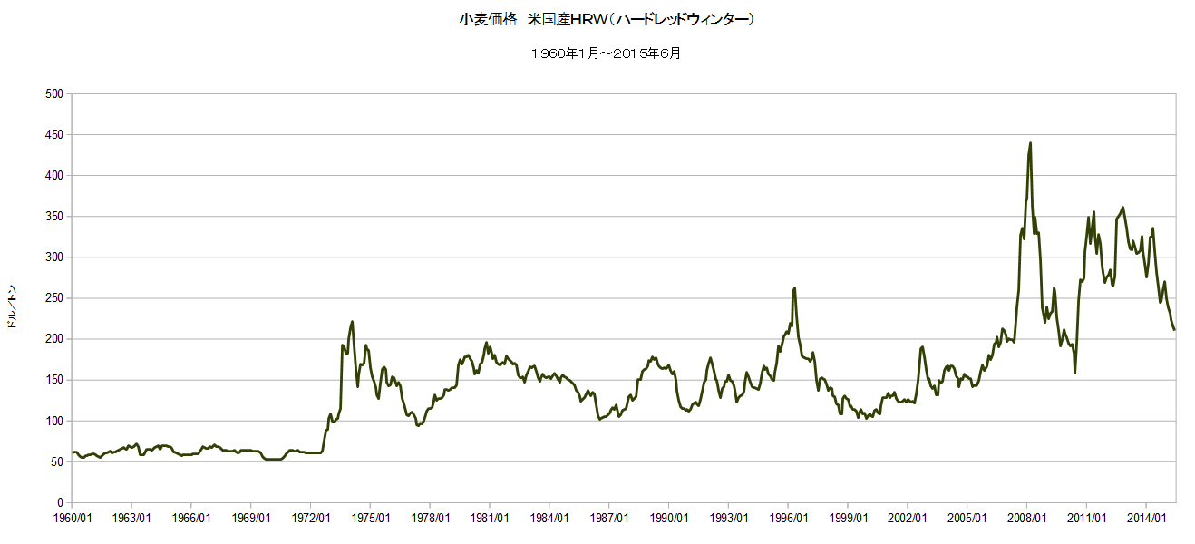 上の最初のグラフは、1960年1月からの小麦(米国産HRW)の月次価格です。