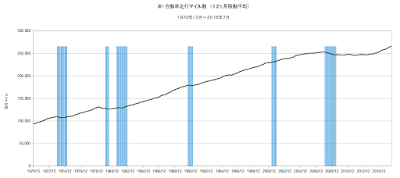 上の最初のグラフは、1970年12月からの米・自動車走行マイル数の推移です。