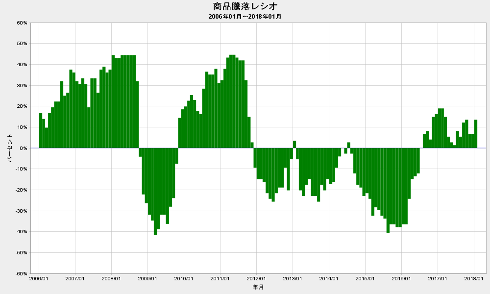 世界銀行が発表している70種類の国際商品の価格データから求めた、2018年1月の商品騰落レシオは、前月から6.8ポイント上昇して、プラス13.5%となりました。