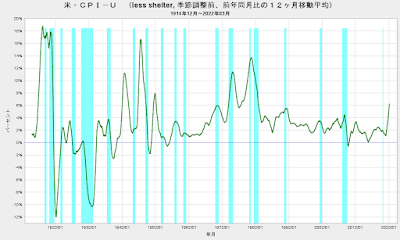 CPI-U(都市部の全消費者、季節調整前、Less Shelter、1982年~1984年基準)